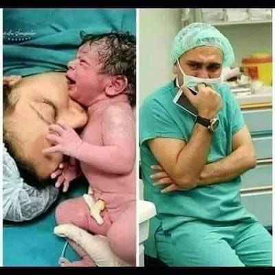 Foto ini diambil setelah proses persalinan melalui operasi selama 7 jam lamanya. Sebelah kiri, foto bayi yang baru lahir dalam pelukan ibunya, sedangkan sebelah kanan, foto dokter yang membantu proses persalinan sedang menangis. Ibu ini menderita penyakit yang tidak memungkinkannya untuk memiliki anak, 11 tahun ia menanti dengan penuh kesabaran, setiap hari bermunajat pada ALLAH agar menganugrahinya seorang anak, doanya akhirnya terkabul namun untuk proses melahirkan sang ibu harus memilih antara dirinya atau anaknya.