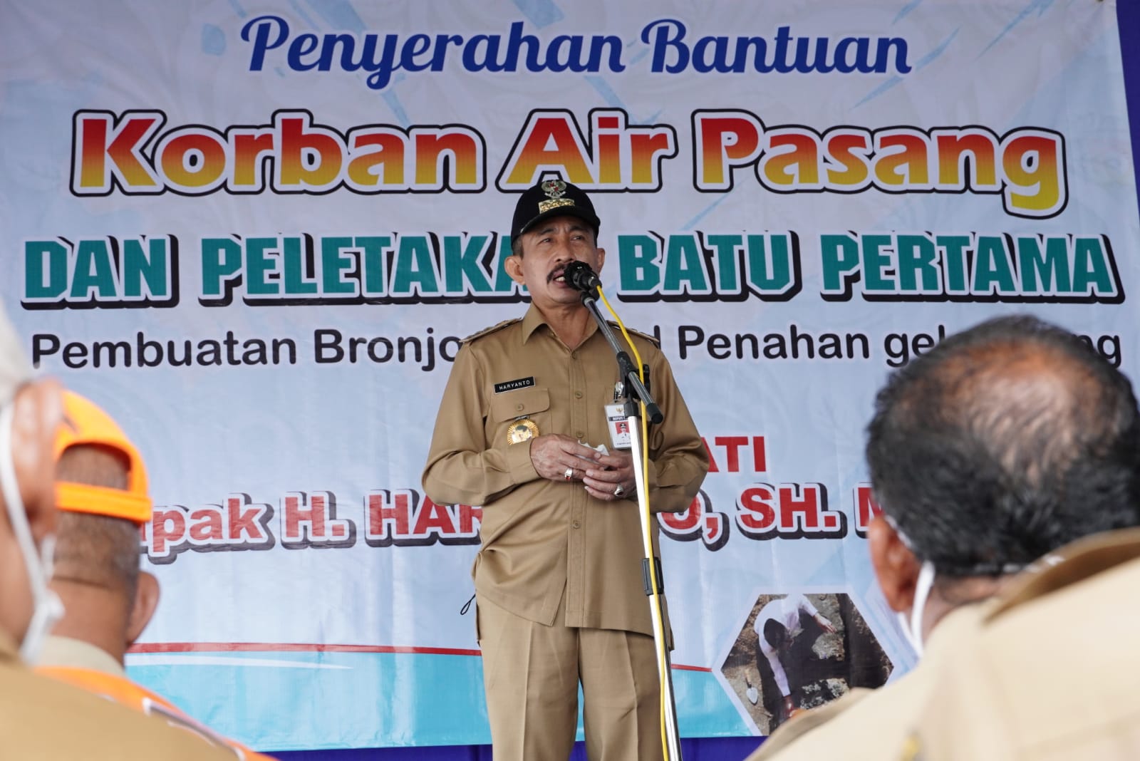 Usai menyerahkan bansos, Bupati juga turun langsung bersama warga masyarakat untuk pembuatan talud sementara, yang berupa bronjong kawat.
