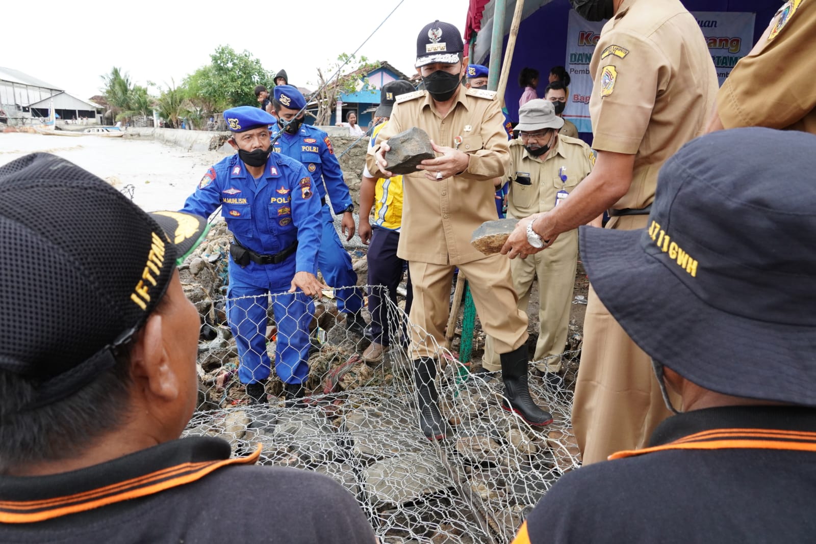 Selain itu, Bupati secara seremonial juga melakukan peletakan batu pertama membuatan bronjong talud penahan gelombang air laut.