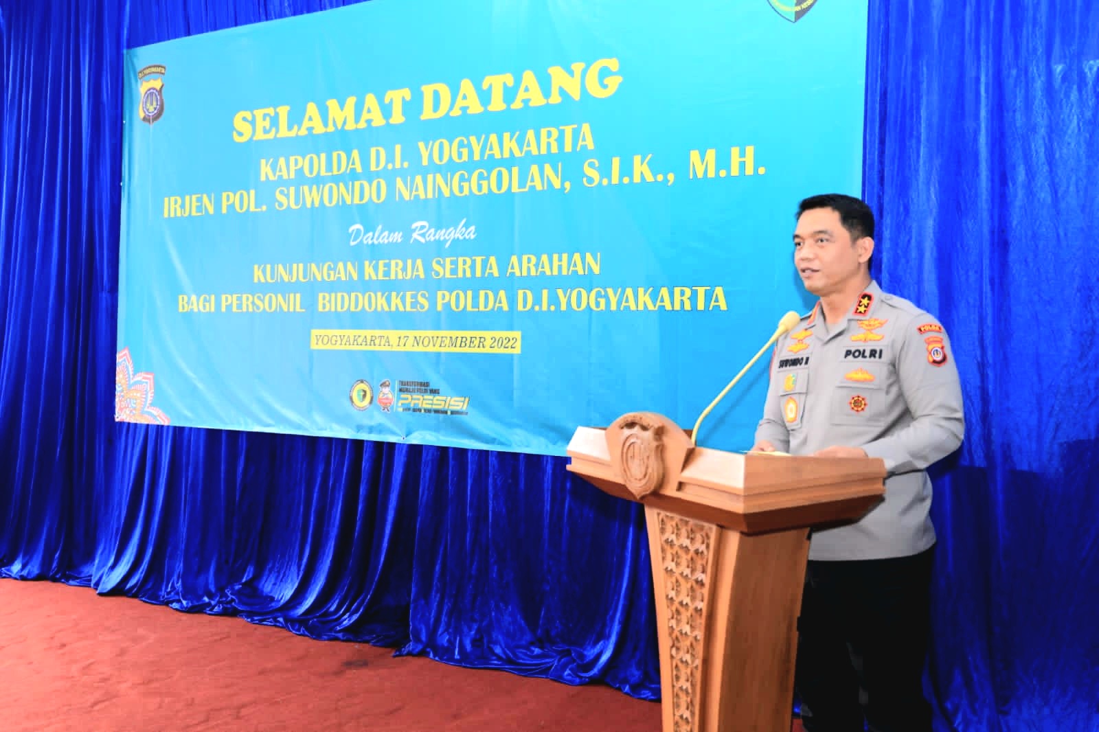 Yogyakarta, INAMEDIA.id – Kapolda DIY Irjen Pol Suwondo Nainggolan, S.I.K., M.H., melakukan kunjungan kerja di Bidang Kedokteran dan Kesehatan (Bid Dokkes) Polda DIY di Balapan Gondokusuman Yogyakarta, 17 November 2022.
